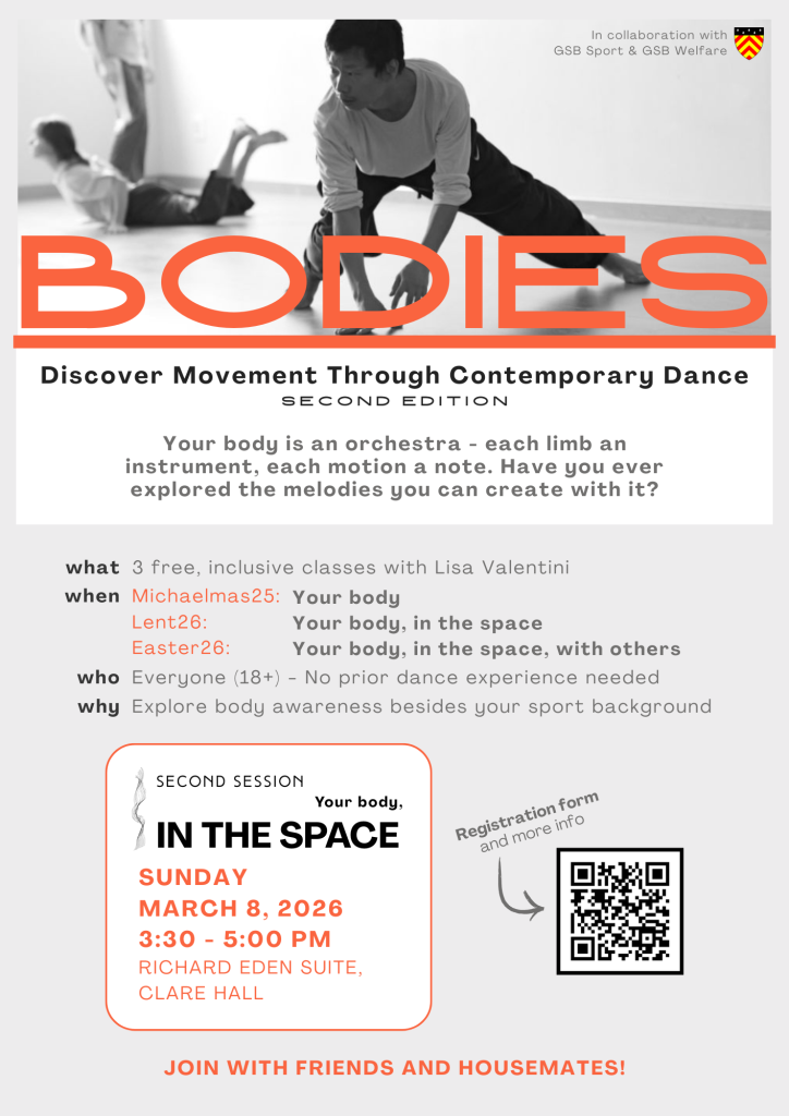 * Lisa Valentini is a Clare Hall PhD student in Mathematics & GSB Green Officer. She has practised contemporary dance for 15 years, and enjoys sharing her passion for body movement. She is not a professional.