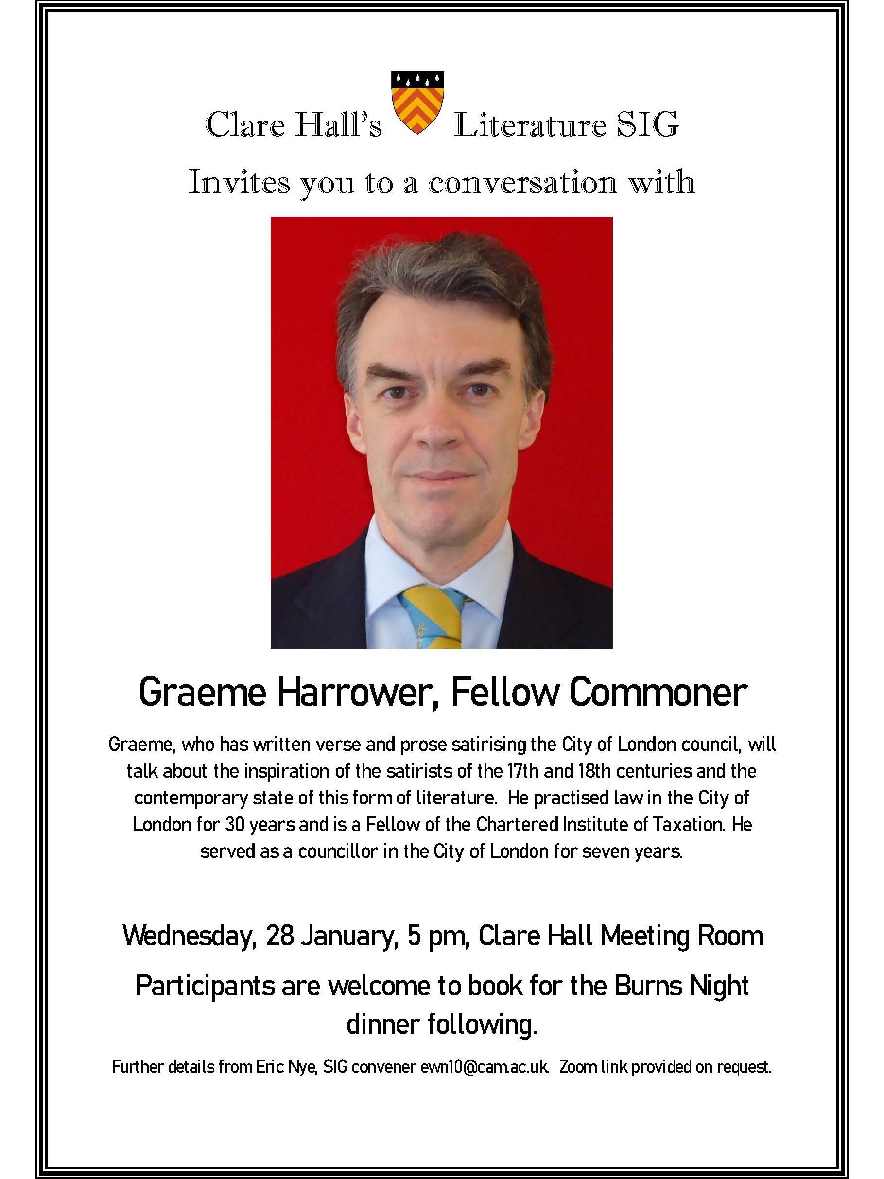 All Clare Hall members are welcome to attend the meetings for the English Literature SIG this Lent term. The full schedule can be found below. Meetings are held at 5pm in the Clare Hall Meeting Room, followed by a group dinner in the Dining Hall.