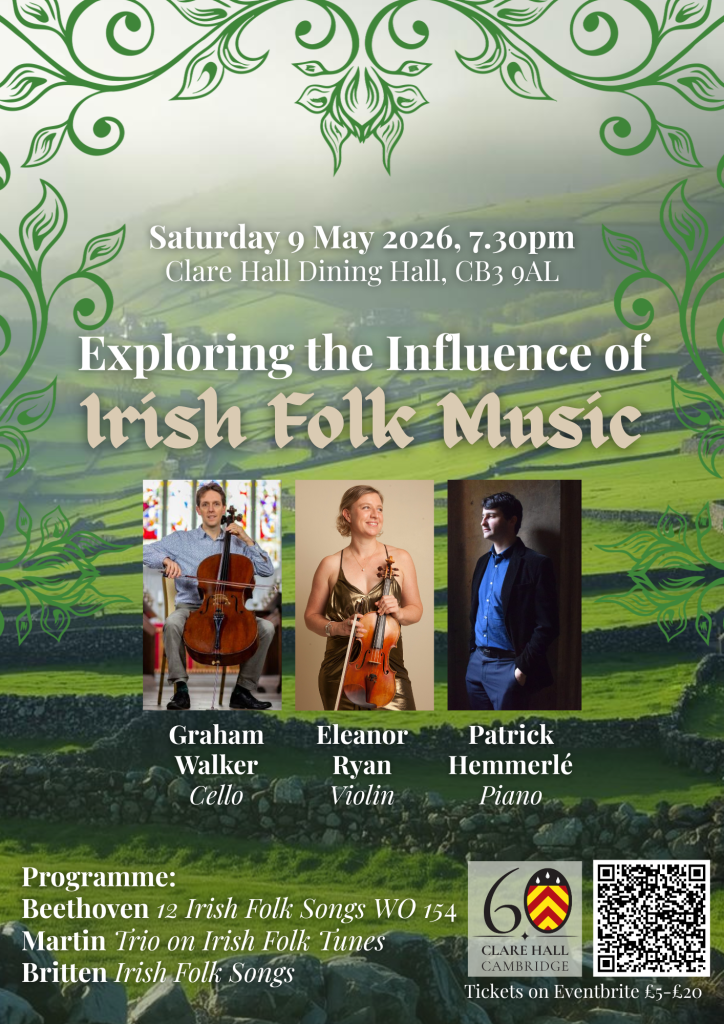 Graham Walker (cello), Eleanor Ryan (violin) and Patrick Hemmerlé (piano) present a programme shaped by the colour and character of Irish folk music. At its heart is Frank Martin’s Trio on Irish Tunes, a lively and captivating work that remains one of his most beloved chamber pieces.